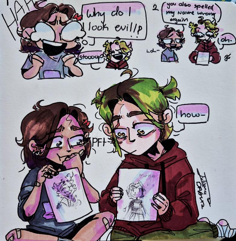 Hello, my name is Juliana (She/Her)... I'm a Christian girl and just a socially awkward, mentally confused artist trying to survive a world that i don't understand. I LOVE foxes, Psychology, and sci-fi, I also like comics and graphic novels, music, and not talking to people or going outside...or bugs... Im just a little alien artist👽🎨 (My twin sister is @LivzDOODLEz !!) My OCs: Markers and J, Dax, Twitch, and Jabbir ADHD and Social Anxiety for the win!!❤️🩹✏️